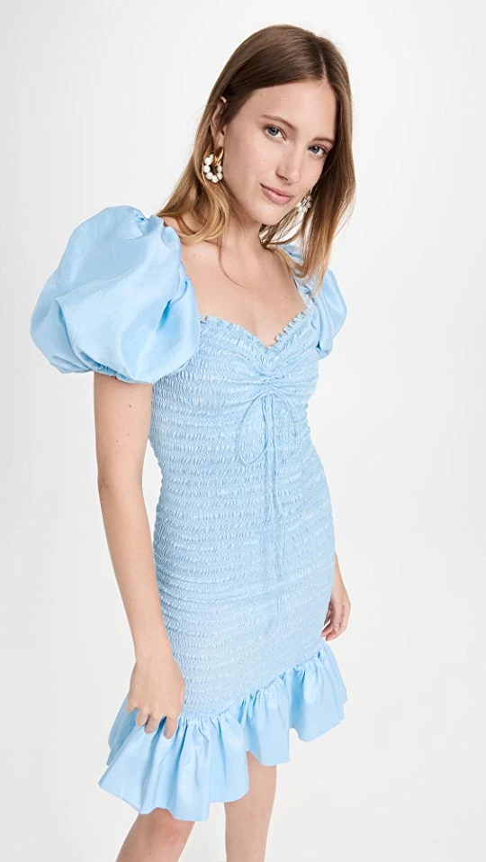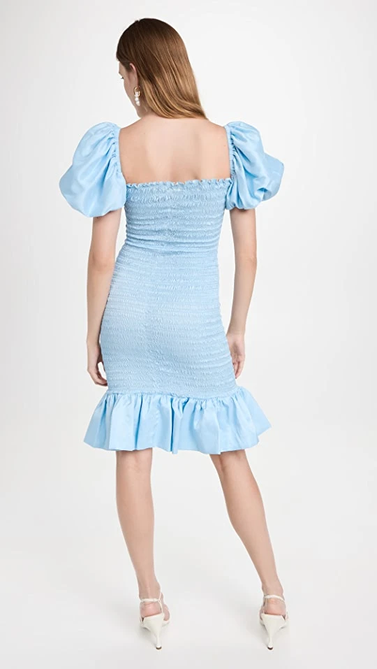 - Square neck and short puff sleeves with elastic edges
