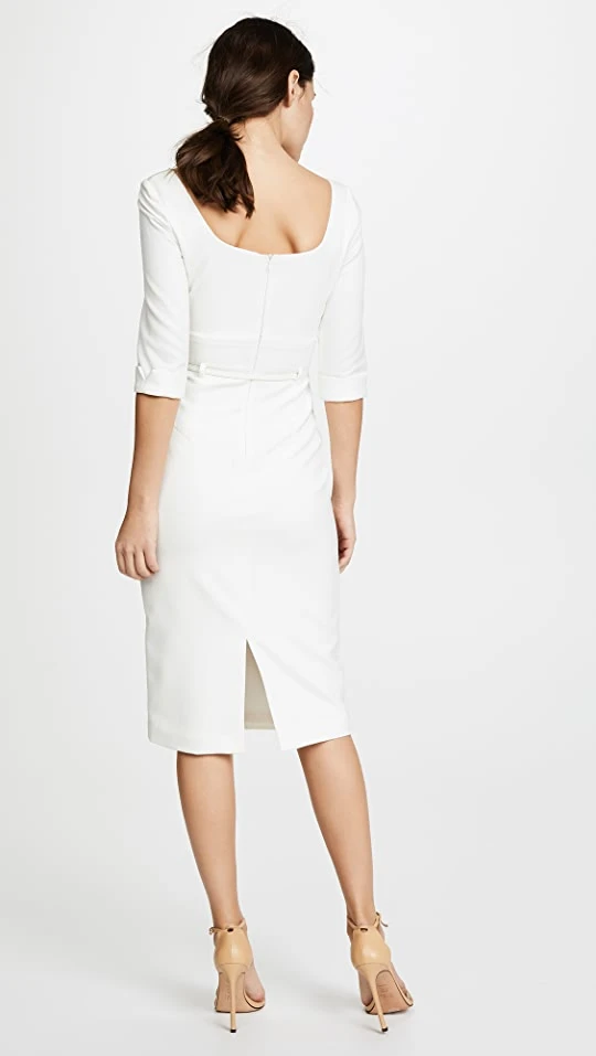 The brand’s signature Jackie O Dress updated with cuffed sleeves. This Black Halo sheath dress features a draped bodice and skinny belt to complete the timelessly elegant silhouette.