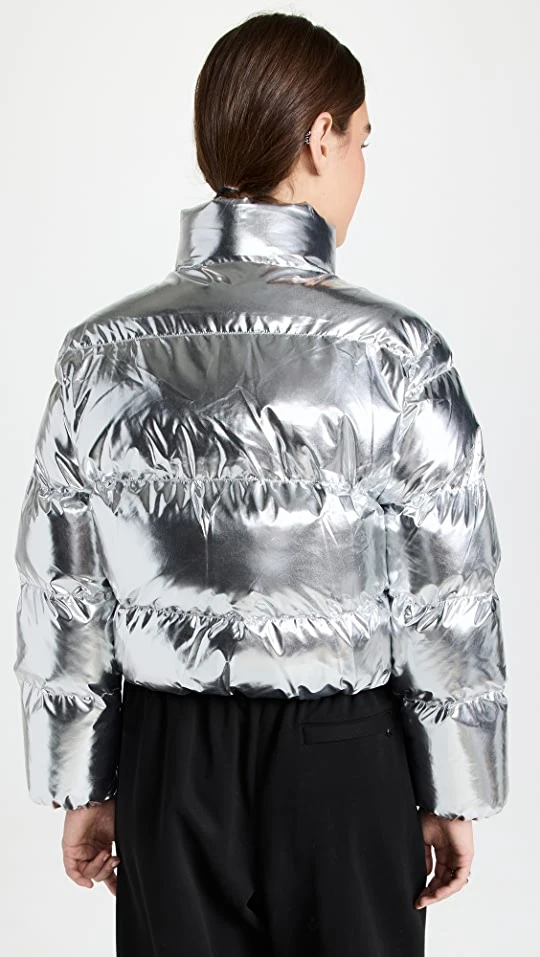 You’ll be sure to shine in this cropped English Factory puffer jacket, which stands out with a metallic, silvery sheen. Give this piece the spotlight it deserves by matching it with an understated pair of high-rise trousers.
