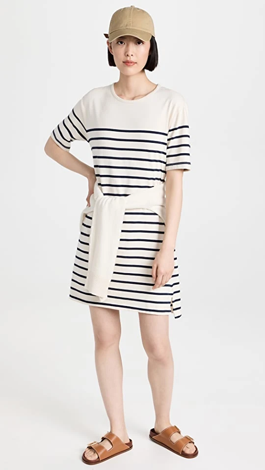 A comfortable Faherty T-shirt dress in an easy shift silhouette, accented with a chic two-tone stripe motif. Sneakers and flat sandals will both suit this piece equally well.