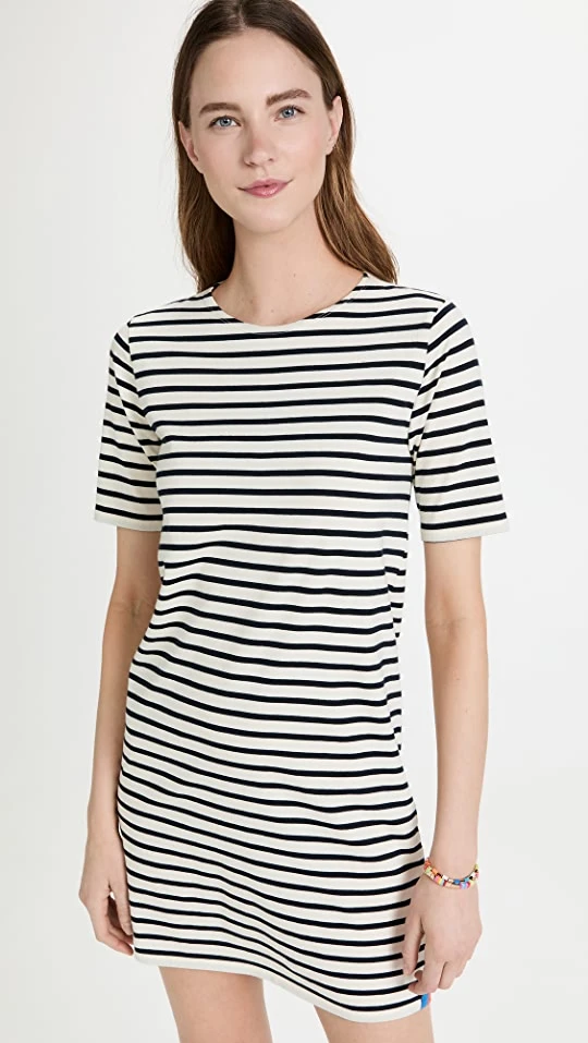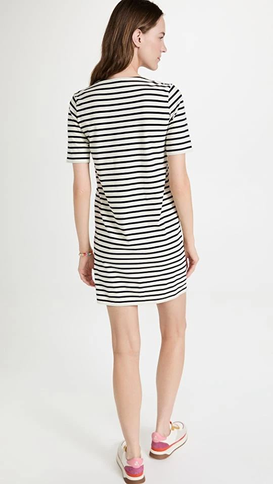 An easy KULE T-shirt dress with a slim silhouette, accented with a chic two-tone stripe motif. Slide sandals and sneakers will both work equally well with this piece.