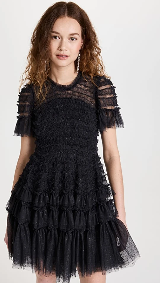 - Tiered silhouette with allover ruffles