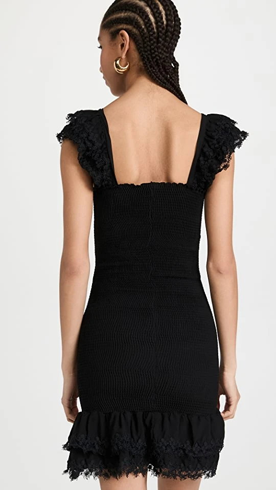 Sleek and chic yet oh-so-charming, this figure-skimming Peixoto black dress has a texture-rich feel, thanks to the combination of tonal lace trim, layered ruffles, and allover smocking.