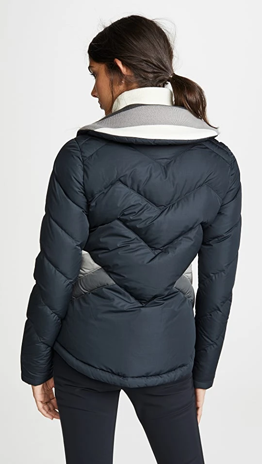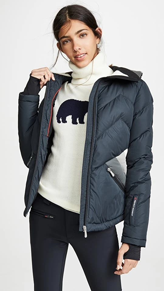 A vintage-inspired design with sporty colorblocking, this Perfect Moment puffer jacket would look right at home on or off the slopes. A high collar adds a modern touch to the retro look.
