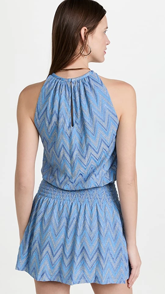 Crafted from slinky metallic fabric, this Ramy Brook dress is enhanced with ruching and a smocked drop waist for a sweet and swingy mini that’s easy to work into day-to-night looks—just swap out your slides for some heels.