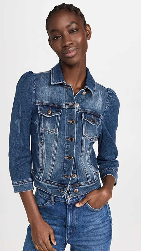 Splitting the difference between pretty and casual style, this slim-fitting Retrofête Ada denim jacket juxtaposes puff shoulders with bold distressing throughout the silhouette.