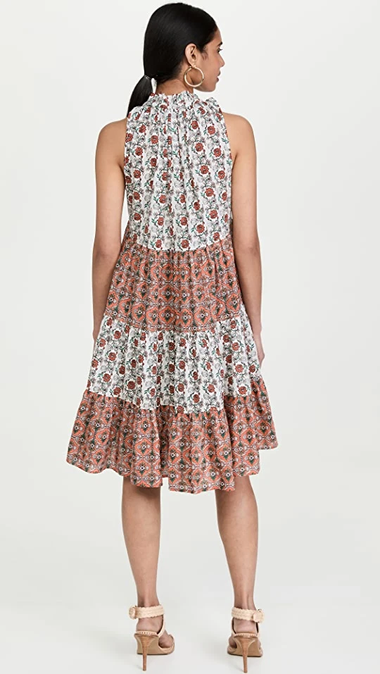 A voluminous Ro’s Garden babydoll dress, featuring a paneled mix of prints. Subtle ruffles accent the shoulder straps.