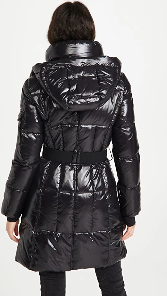A high-gloss SAM. puffer jacket, filled with lightweight goose down and featuring a pair of always-welcome additions: thumb-hole cuffs to keep your hands warm and a buckle belt to keep the silhouette cinched. Wear this piece with dark-wash skinny jeans for a sleek cold-weather look.