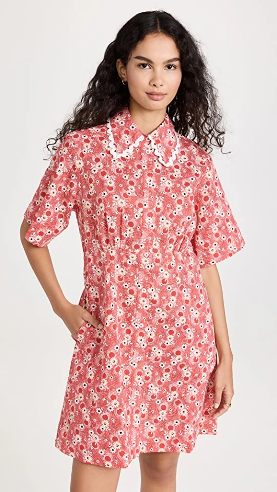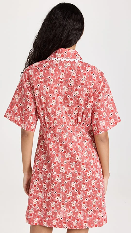 Pretty and unique in equal measure, this Sea mini dress features allover eyelet patterning, a geometric print, and a fold-over collar that’s traced with rickrack trim.