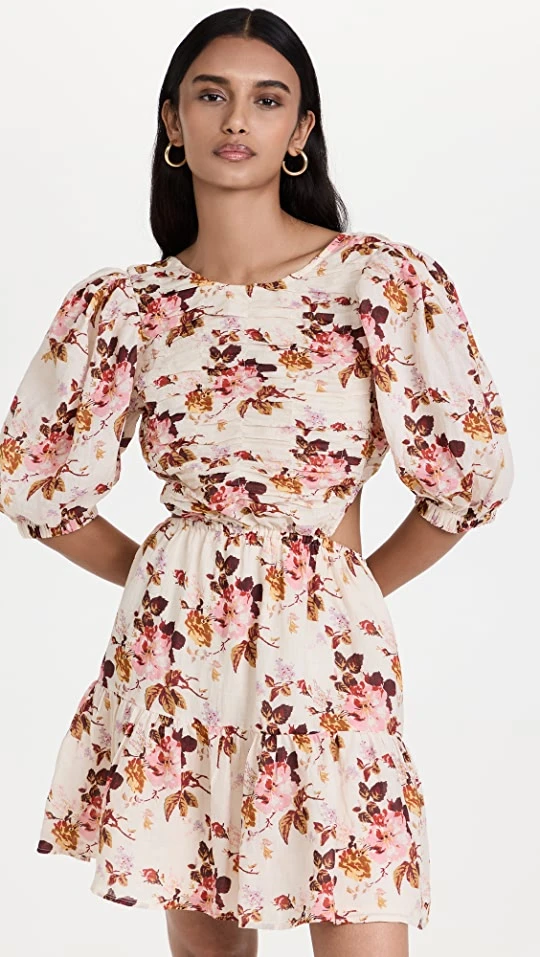 Take your summer-day look in a more polished direction with this Sea mini dress. Softly colored with a floral pattern, this piece looks lovely with voluminous proportions and a wraparound cutout at the waist.