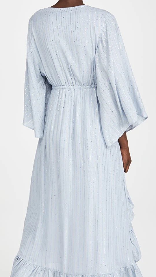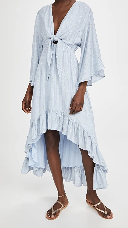 Streaks of metallic thread, a dramatic high-low hem, and a plunging neckline make this SUNDRESS cover-up a dramatic beach-day option. Complete your outfit with the sandals of your choice.
