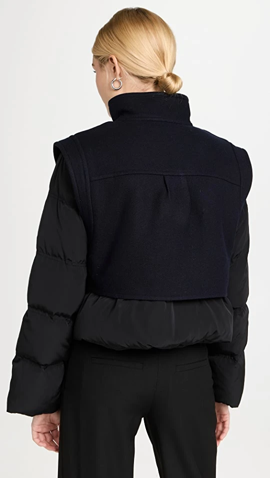 - Wool vest with high neckline, button placket, and flap breast pockets